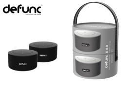 DEFUNC DUO ist ein einzigartiges tragbares Stereo-Soundsystem mit zwei runden Bluetooth-Lautsprechereinheiten,